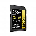 The 256GB Professional 1800x UHS-II SDXC Memory Card (GOLD Series, 2-Pack) from Lexar features a storage capacity of 256GB per card and takes advantage of the UHS-II bus to support advanced DSLR functions such as continuous shutter bursts and rapid shooting, as well as raw and JPEG captures. This card is also well-suited for video capture, including 4K, 3D, and Full HD video, and can achieve maximum read speeds of up to 280 MB/s and maximum write speeds of up to 180 MB/s. Thanks to its V60 speed class rating, minimum write speeds are guaranteed not to drop below 60 MB/s.