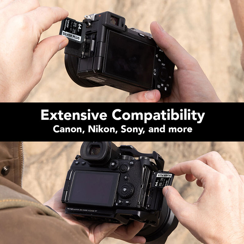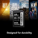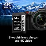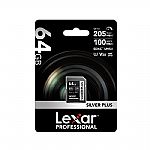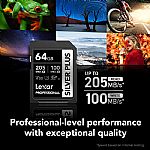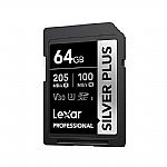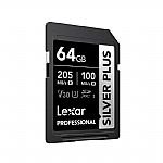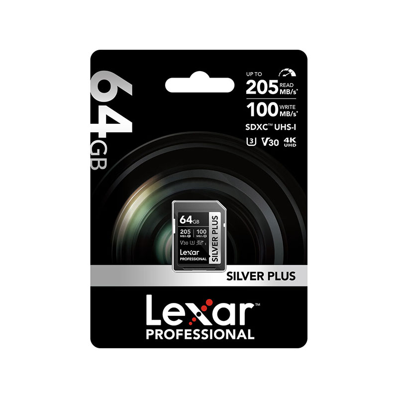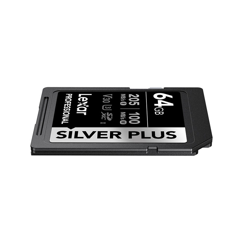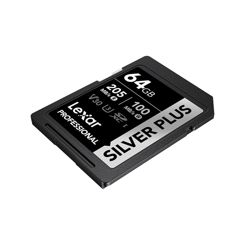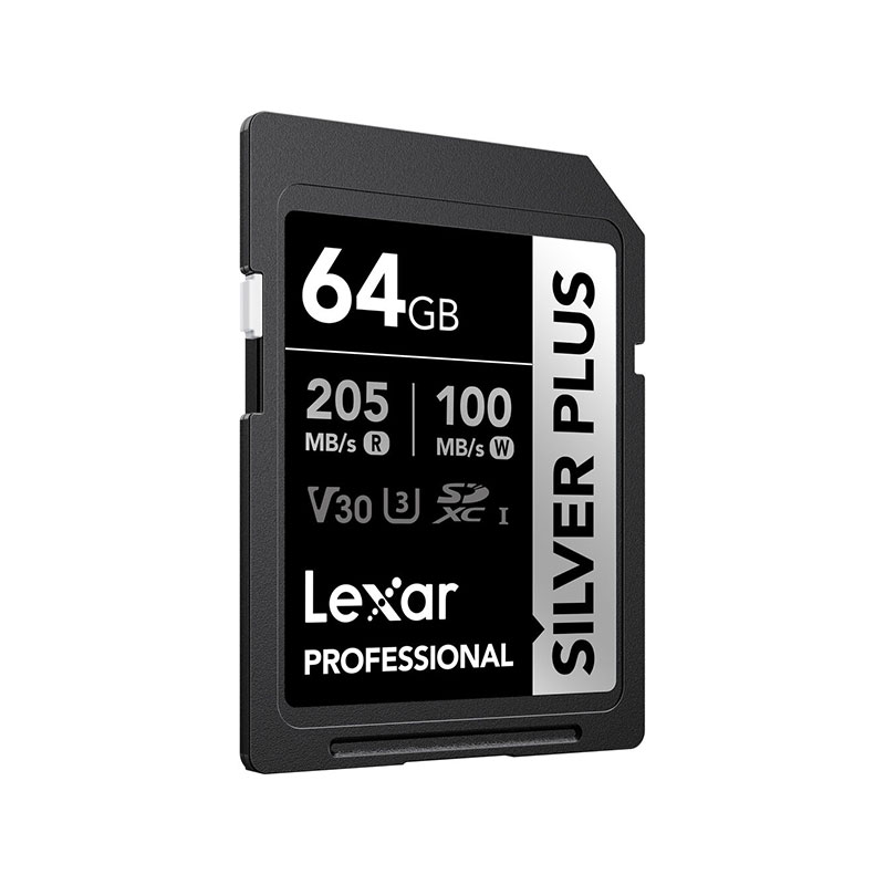 The Lexar Professional SILVER PLUS 64GB UHS-I SDXC card delivers fast, reliable performance for Full HD and 4K/60p video. With read speeds up to 205 MB/s and write speeds up to 100 MB/s, it's ideal for rapid shooting and continuous bursts. Its V30 rating ensures a minimum write speed of 30 MB/s, making it perfect for demanding photo and video workflows. Built for creators who need speed and consistency.